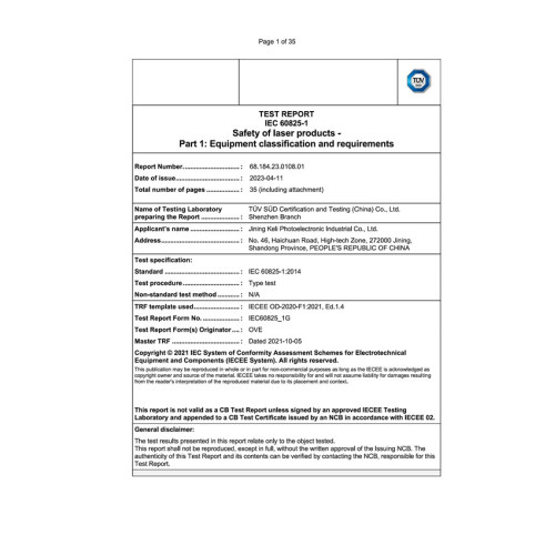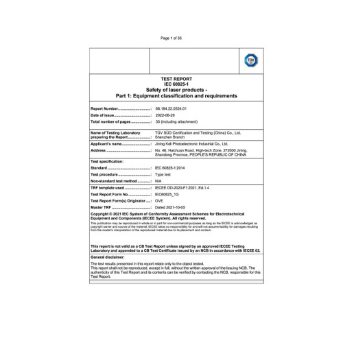 ОТЧЕТ ИСПЫТАНИЙEC 60825-1 Безопасность лазерных изделий. Часть 1: Классификация оборудования и требования.